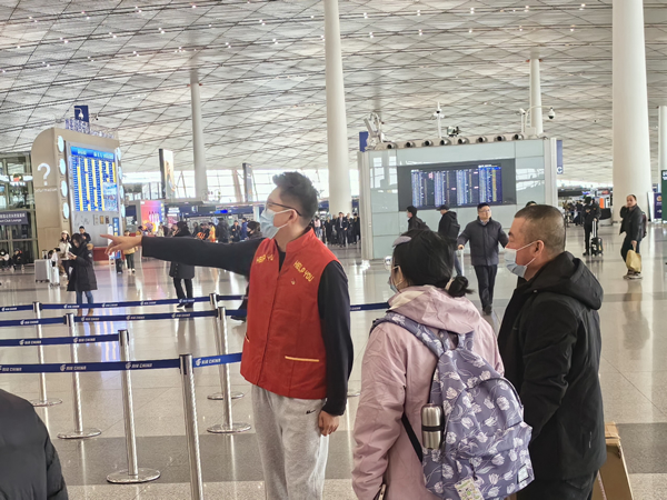 春運以來,首都機場“人氣”持續(xù)攀升,現場保障壓力也逐漸凸顯。航站樓管理部青年們從小事做起、從細處著眼,致力為旅客提供更好的全流程出行體驗。團員青年們分別在旅客集中的四層值機區(qū)和二層到達區(qū)為有疑惑的旅客提供進出港流程、相應值機柜臺、登機口位置、安檢禁限帶物品、三超行李、交通出行指引等信息的提示;重點關注兒童、老年人和輪椅旅客等特殊旅客群體,提供熱情貼心的服務。此外,大家還結合自身業(yè)務,積極投入到行李后廳、電扶梯、值機柜臺、消防設備等各個現場或各類設施設備的檢查工作中,全力保障行李運輸順暢無損、現場設備安全可靠,讓旅客出行舒適溫馨。